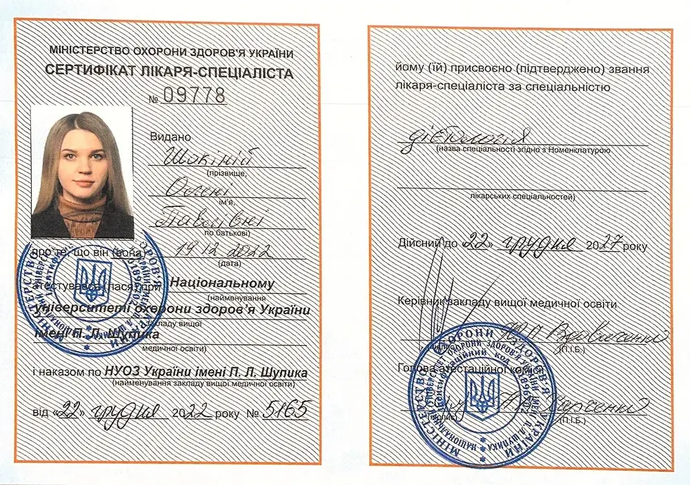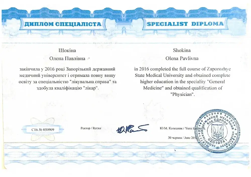 - Запорожский государственный медицинский университет, лечебное дело (2016);