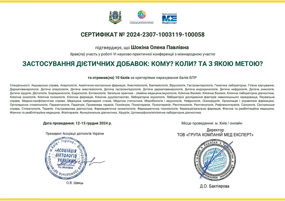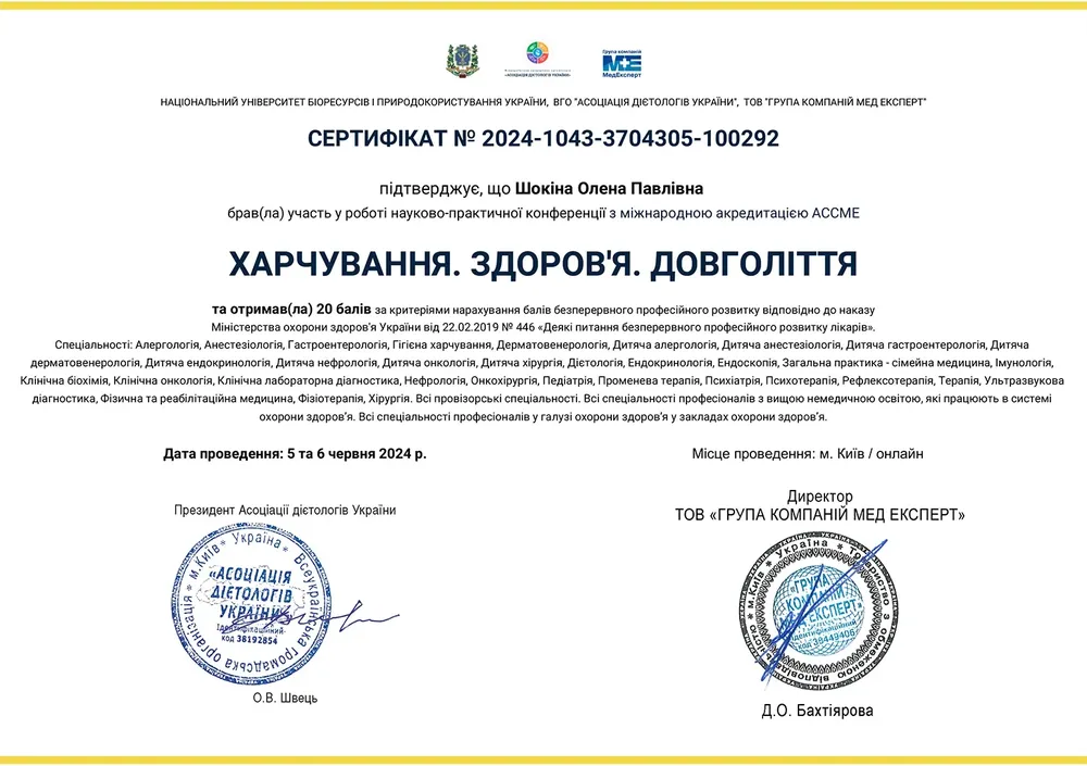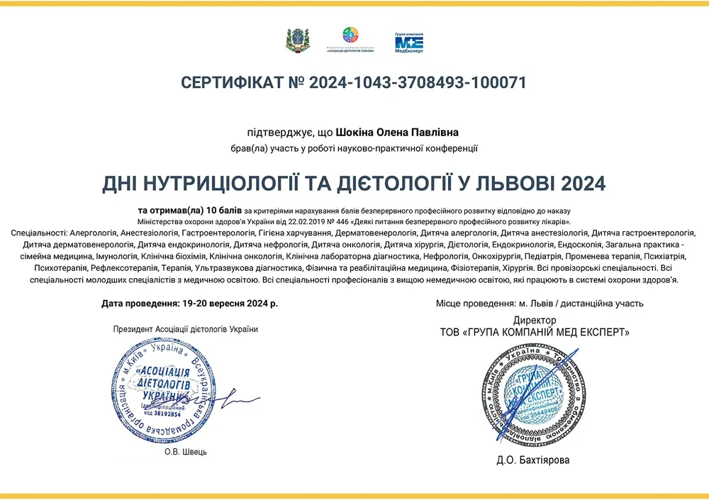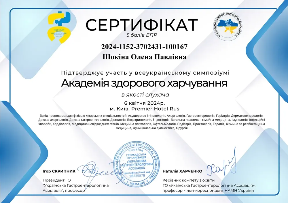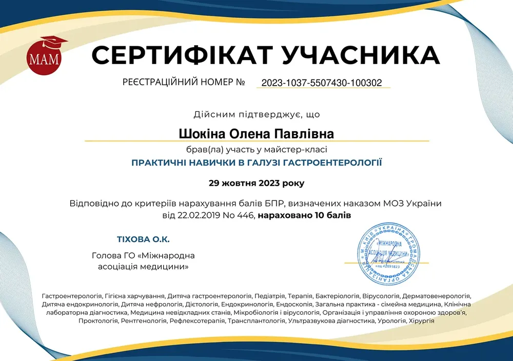 - Прошла курс непрерывного медицинского образования на основе доказательной базы «Гастропарез и функциональная дисперсия: малоизвестные особенности патогенеза и лечения», аккредитованного Королевским колледжем врачей (Великобритания).